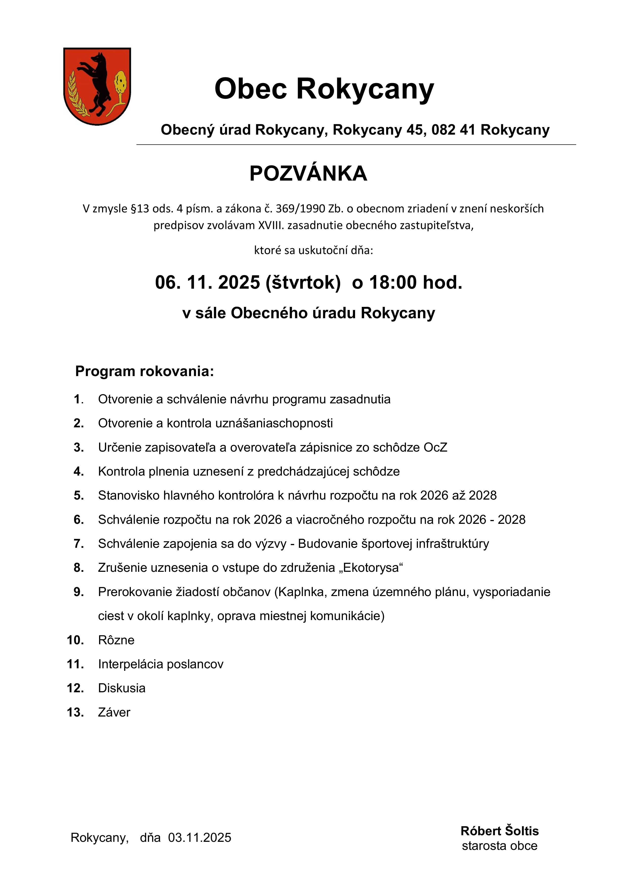 Pozvánka na XVIII. zasadnutie Obecného zastupiteľstva dňa 06.11.2025